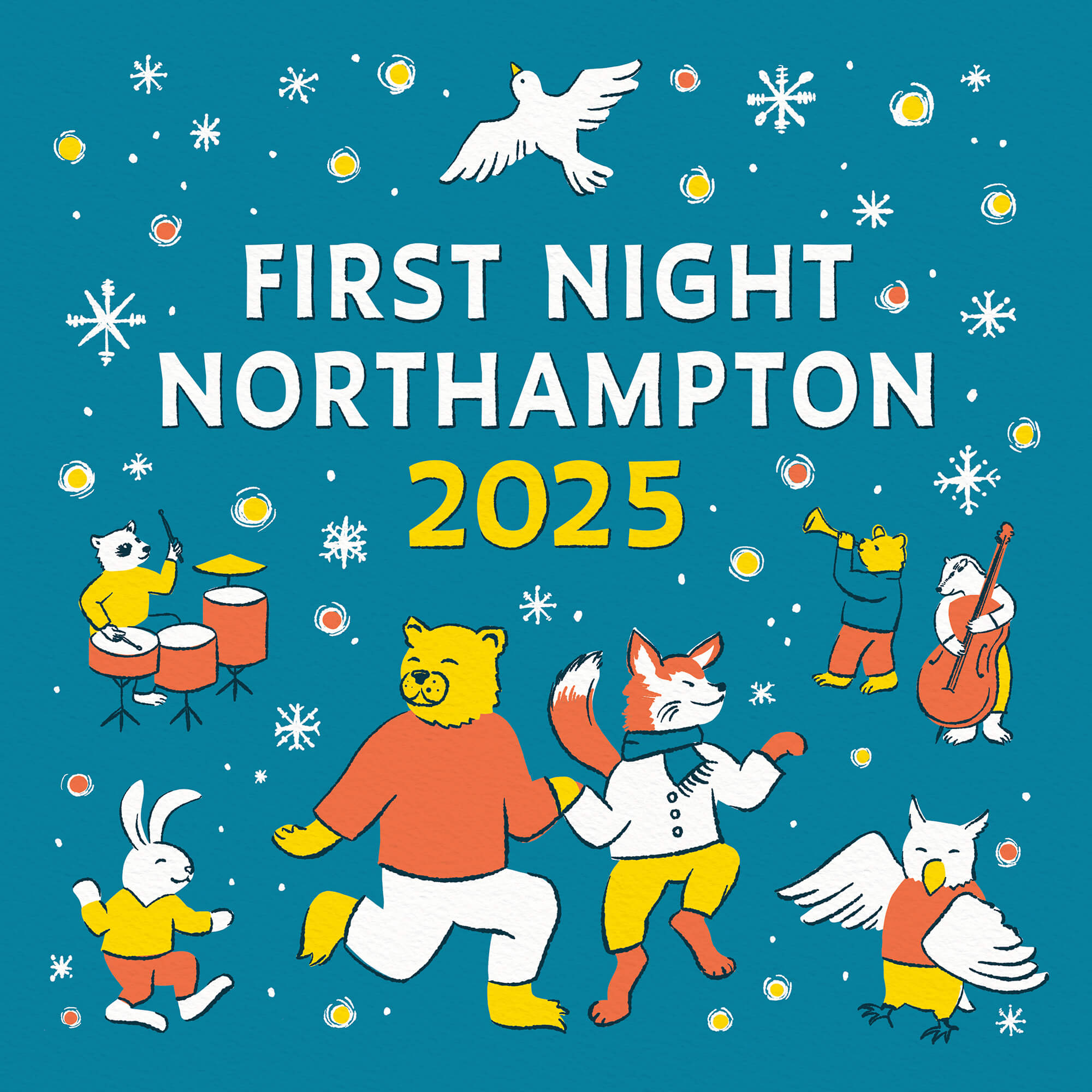 This artwork was created for First Night Northampton, an annual New Year’s Eve celebration organized by the Northampton Arts Council and partners. The goal was to create illustrations that feel joyful, family-friendly, and fun, reflecting the vibe of the event.
