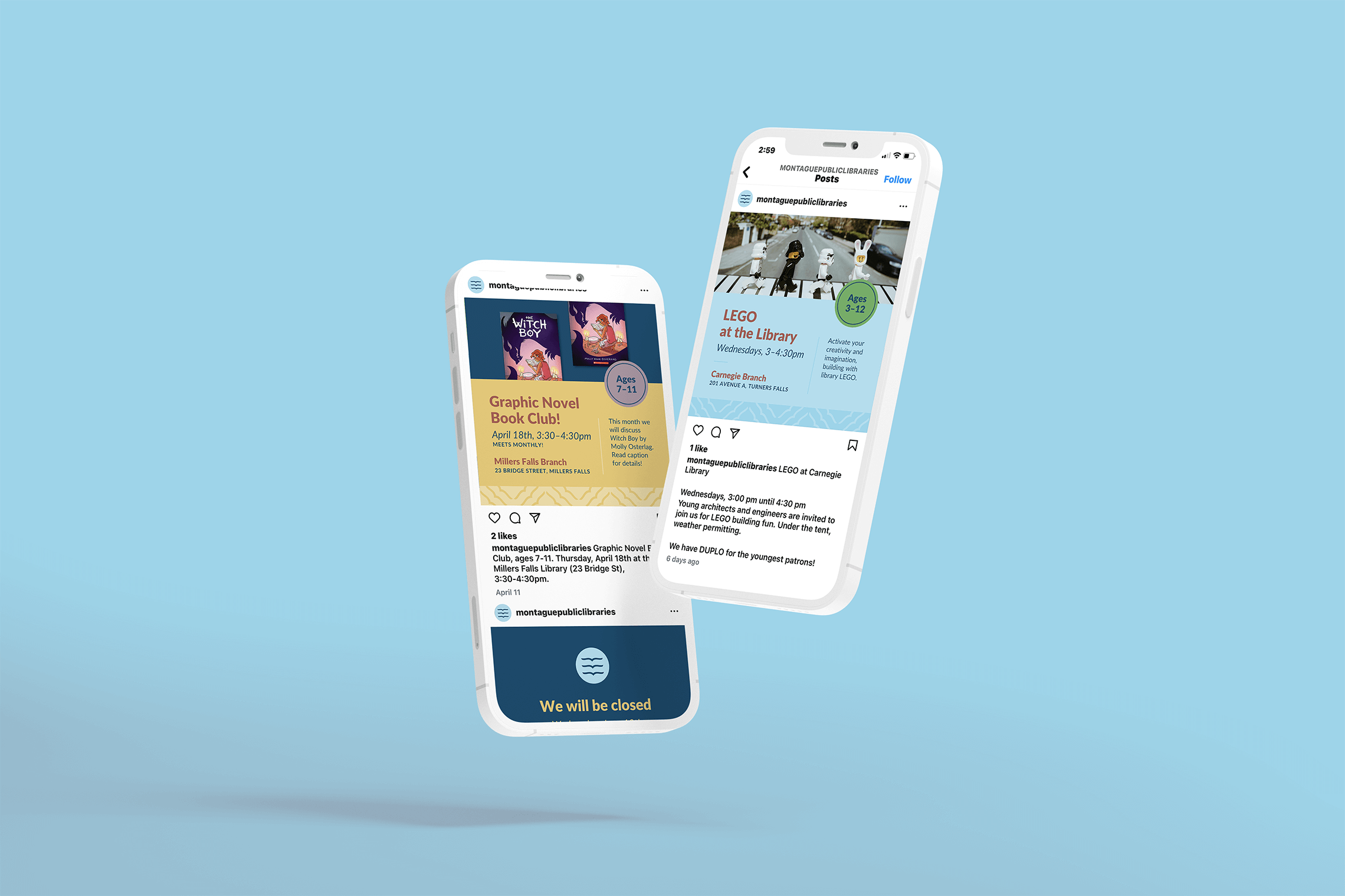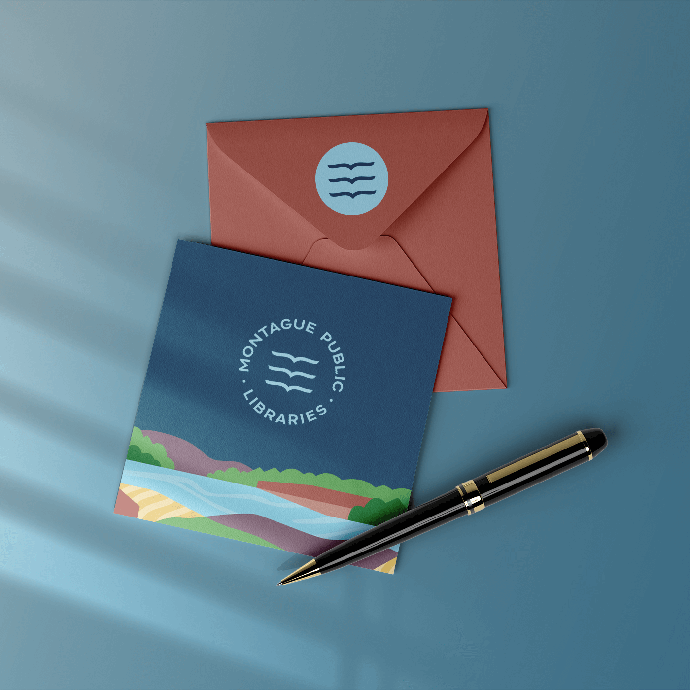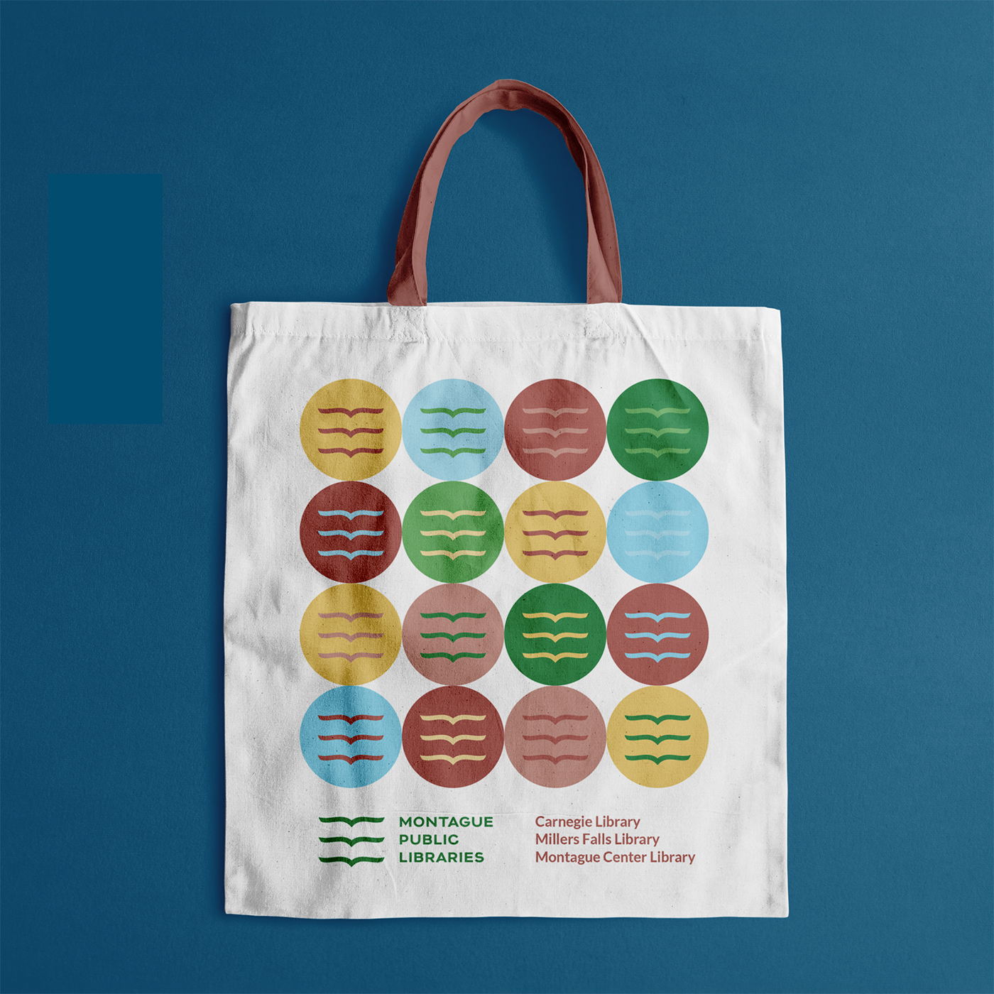 We added depth to the brand through several brand patterns, which include an abstract Montague landscape and patterns made with the book/bird icon. It was a pleasure to work with a public library in my town!